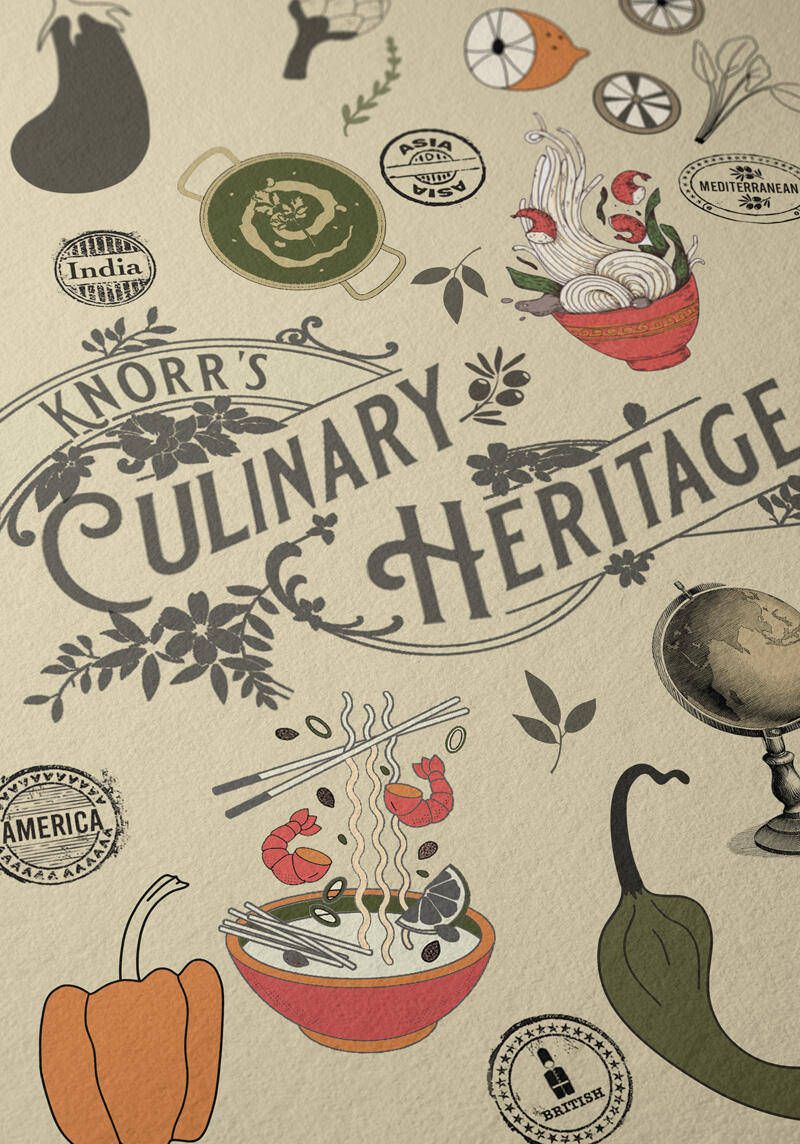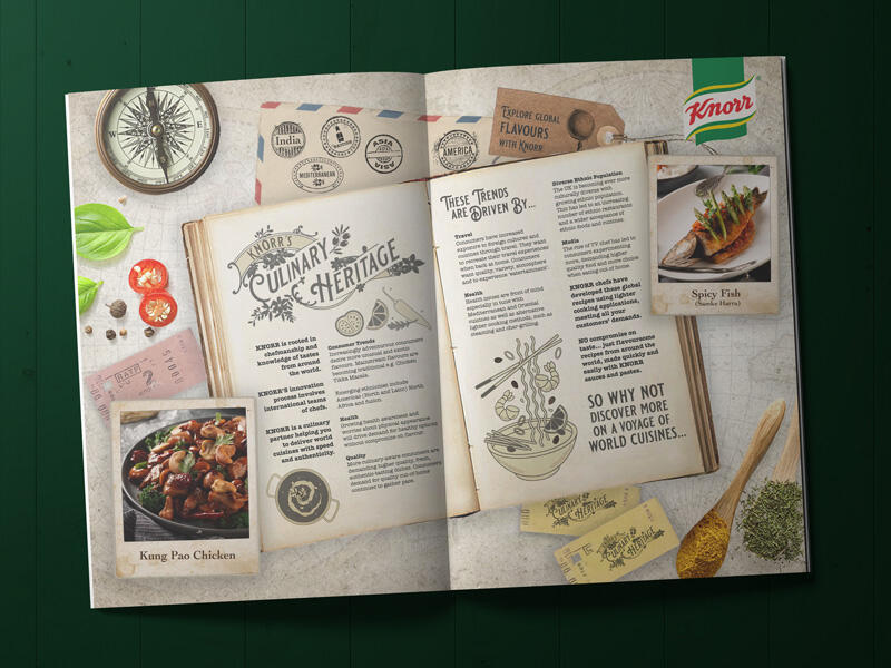 A trade-focused campaign supporting Knorr’s professional ready-to-use sauces, centred around heritage global cuisines and culinary tradition. The work explored how chefs could bring world flavours into their kitchens with ease, from Thai-inspired dishes to classic Italian favourites, using convenient, high-quality sauce bases.The project included the design of a sales brochure, supported by logo and illustrative elements that helped communicate both authenticity and practicality within a professional catering environment.