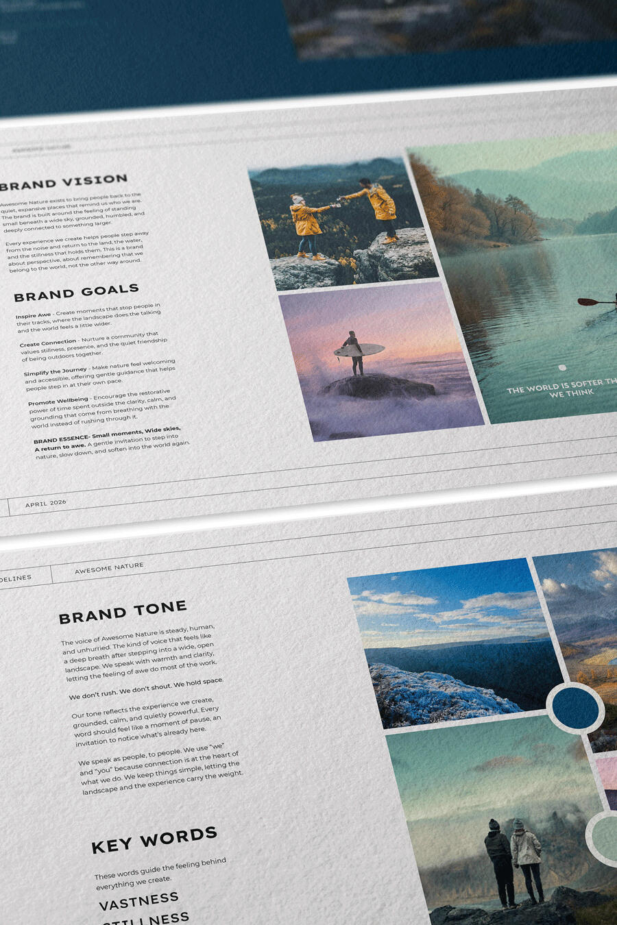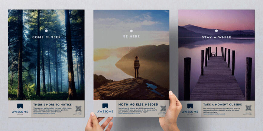 Awesome Nature is built around the quiet power of perspective, inviting people to slow down and reconnect with the world around them. The identity draws on expansive landscapes and a softened, minimal palette to create a sense of calm, space and belonging. Simple, grounded typography and considered messaging allow the feeling of awe to lead, supporting a brand that feels both reassuring and quietly transformative. The result is a thoughtful, accessible identity that encourages people to step outside, breathe deeply, and feel part of something larger.