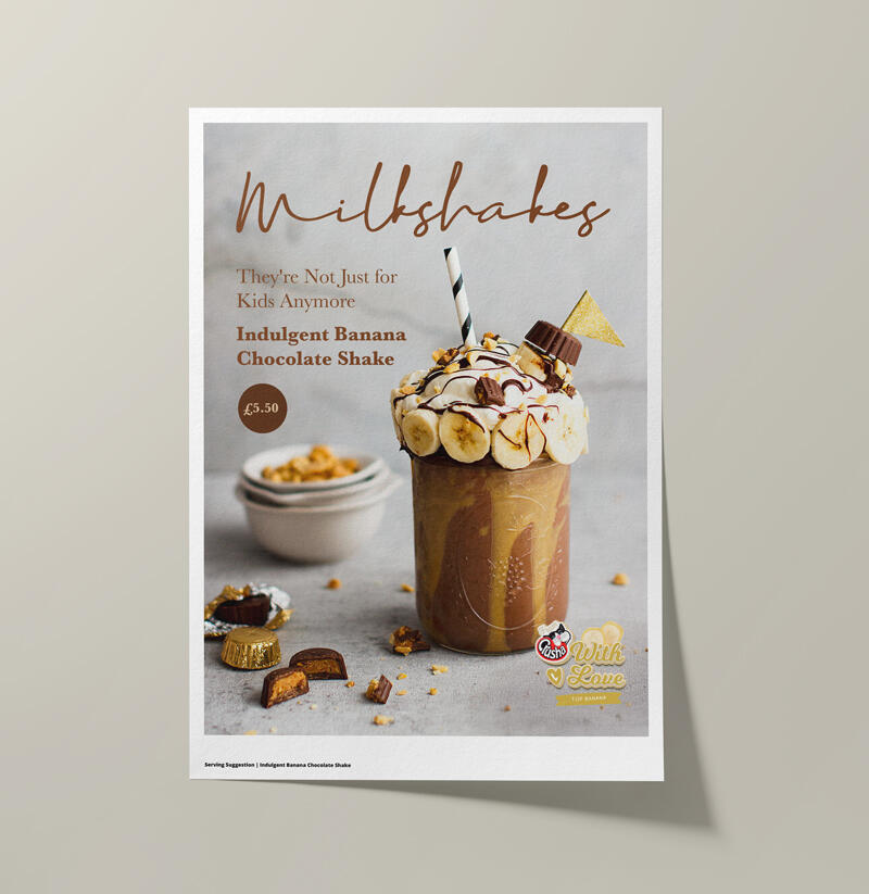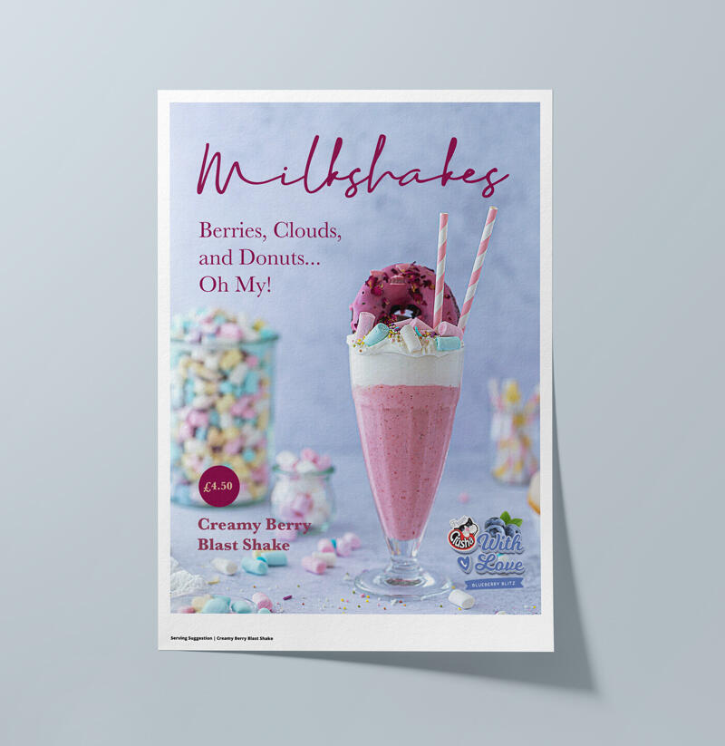 A café-focused campaign concept designed to help independent operators compete with high street chains through a more elevated milkshake offer. By softening the brand presence and focusing on appetite-led visuals, the “With Love” direction created a warmer, more engaging in-store experience. The work included posters, window graphics and takeaway applications designed for practical café environments.