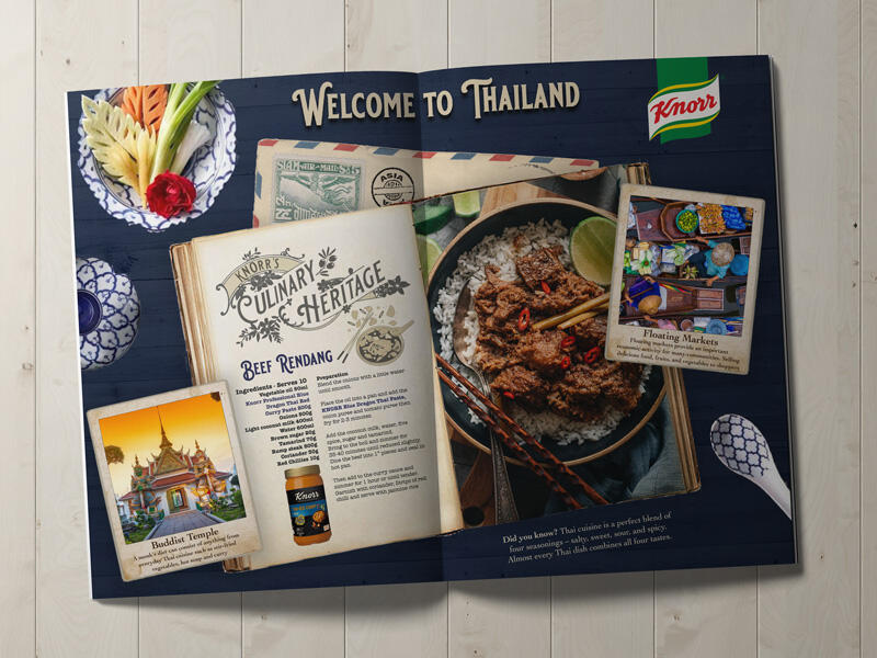 A trade-focused campaign supporting Knorr’s professional ready-to-use sauces, centred around heritage global cuisines and culinary tradition. The work explored how chefs could bring world flavours into their kitchens with ease, from Thai-inspired dishes to classic Italian favourites, using convenient, high-quality sauce bases.The project included the design of a sales brochure, supported by logo and illustrative elements that helped communicate both authenticity and practicality within a professional catering environment.