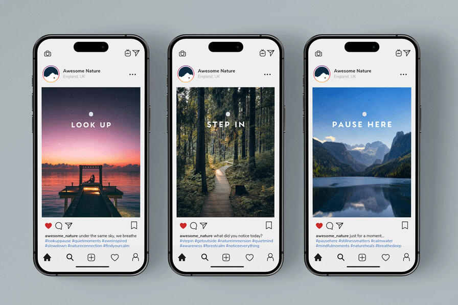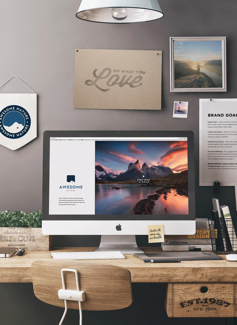 Awesome Nature is built around the quiet power of perspective, inviting people to slow down and reconnect with the world around them. The identity draws on expansive landscapes and a softened, minimal palette to create a sense of calm, space and belonging. Simple, grounded typography and considered messaging allow the feeling of awe to lead, supporting a brand that feels both reassuring and quietly transformative. The result is a thoughtful, accessible identity that encourages people to step outside, breathe deeply, and feel part of something larger.